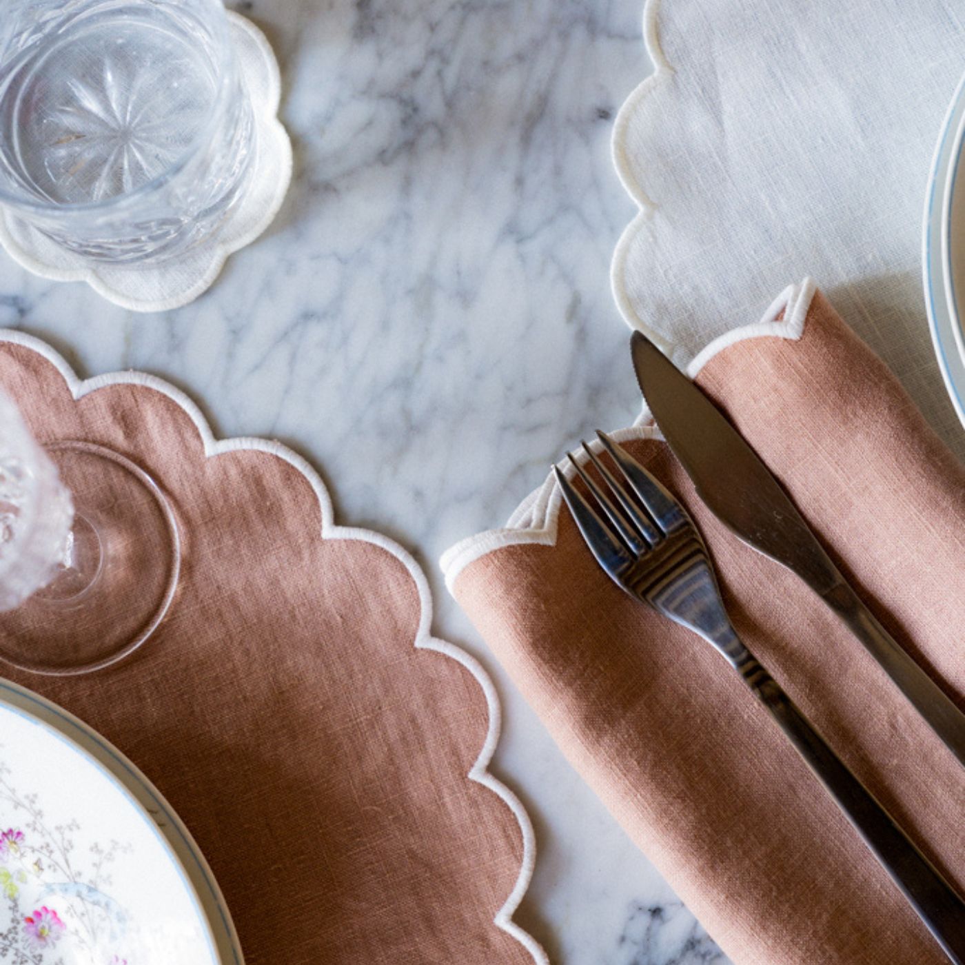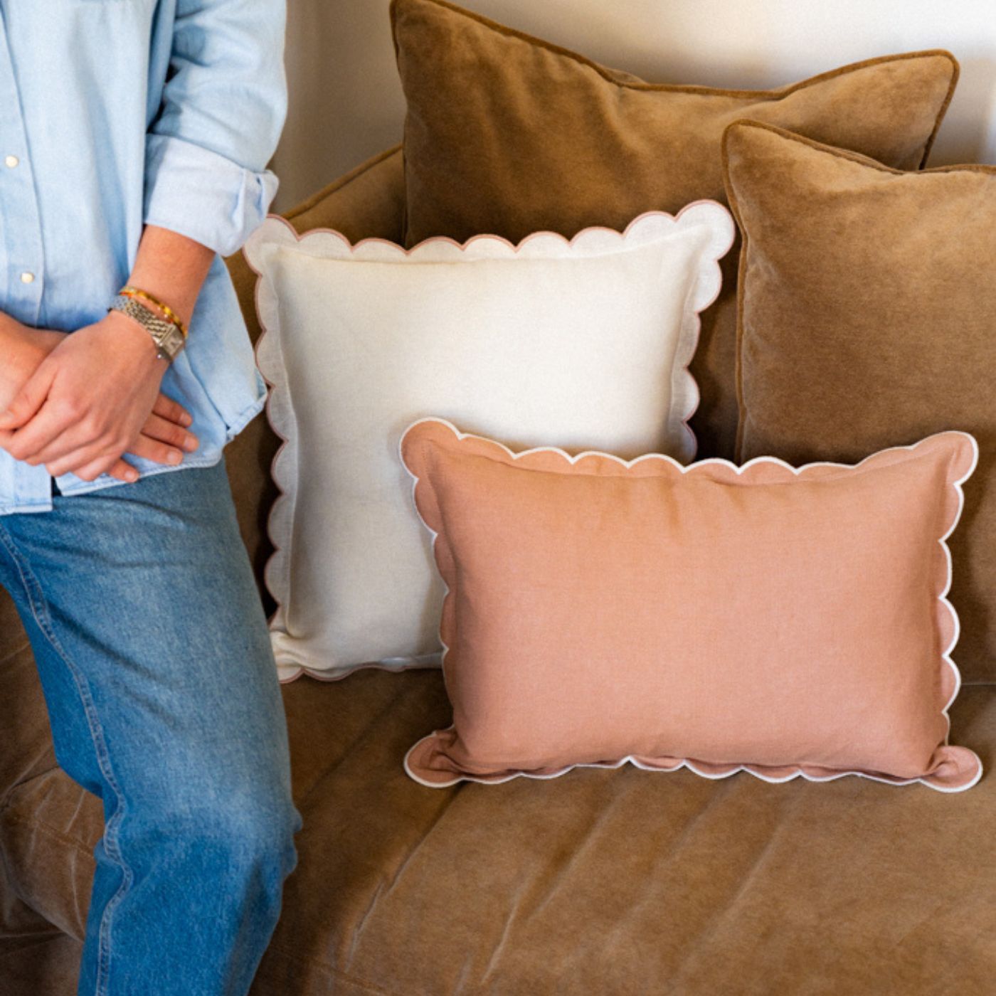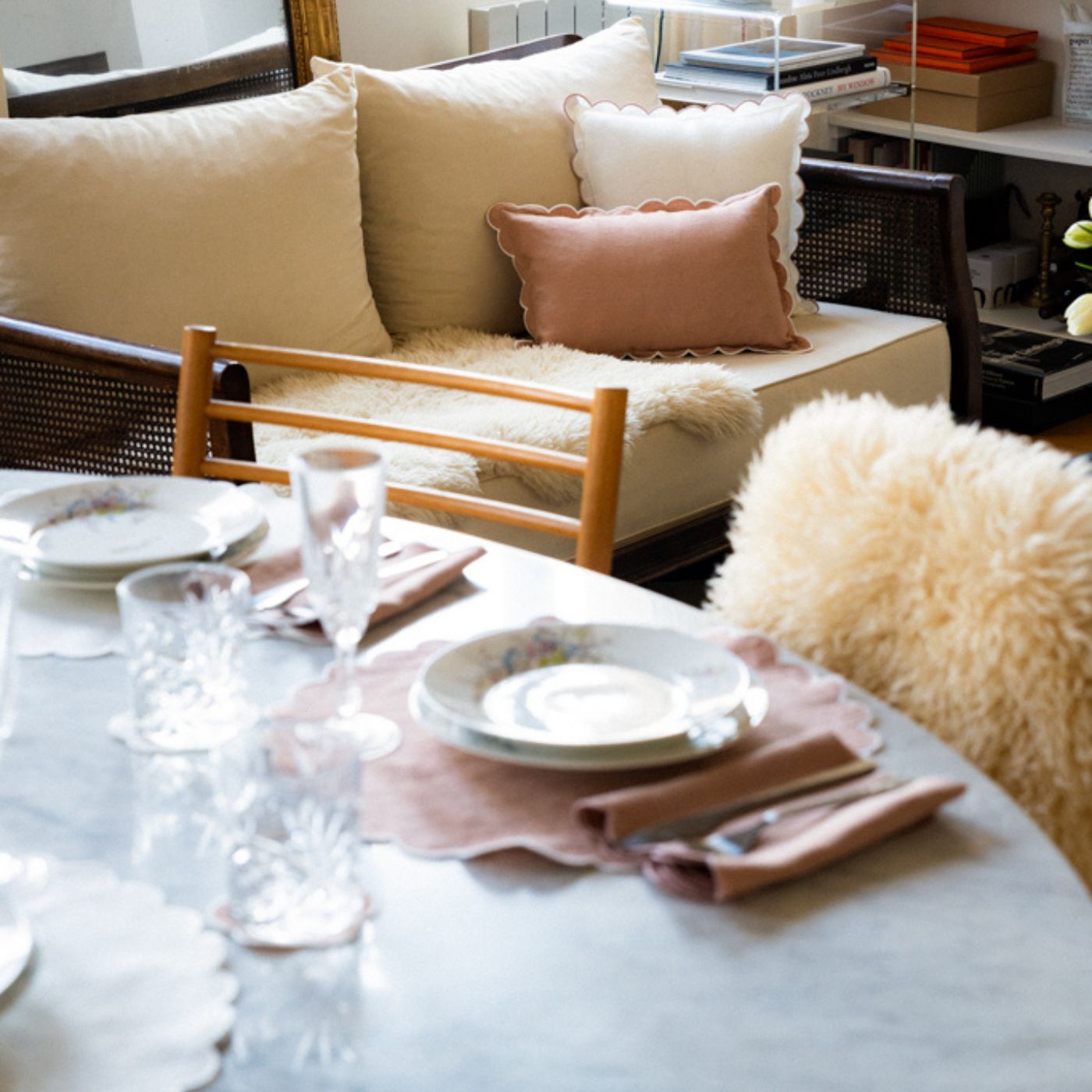 Les sets de table festonnés rose et blanc, et les coussins également qui vont naviguer entre le salon et la chambre. J’aime beaucoup la dernière nouveauté avec le linge de lit en percal de coton.