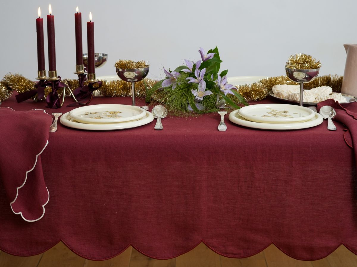 Les serviettes de table festonnées en lin Bordeaux & Blanc