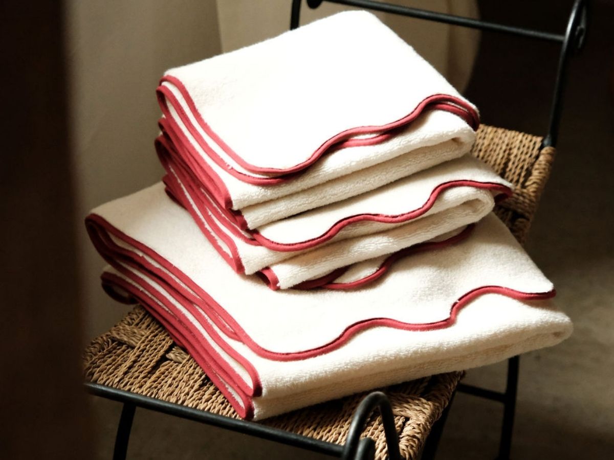 Le linge de bain Tomète s’habille de trois variations élégantes : ivoire/biais ondulé ivoire, ivoire/biais ondulé bordeaux et ivoire/biais ondulé noir. Des teintes intemporelles et raffinées qui s’intègrent facilement dans toutes les salles de bain.