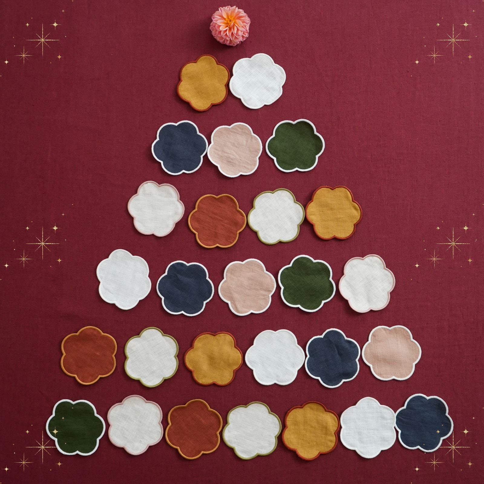 Les serviettes de table festonnées en lin Bordeaux & Blanc