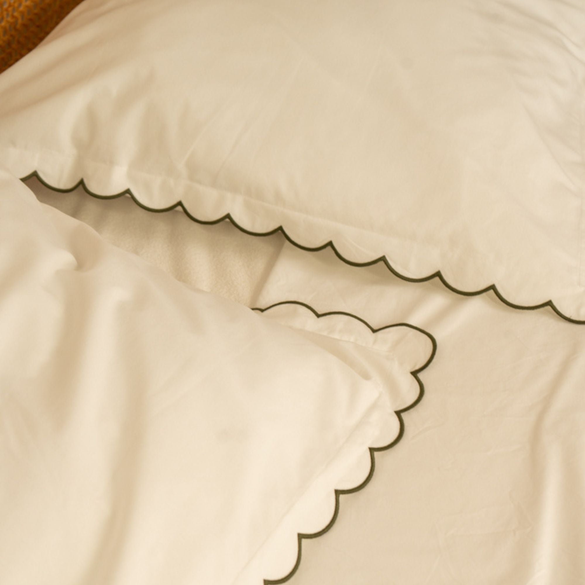 Linge de lit festonné en coton percale premium, pour passer des nuits aussi douces que belles.