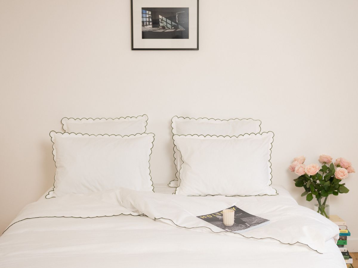 Scalloped pillowcases in white and forest green cotton percale (set of 2)