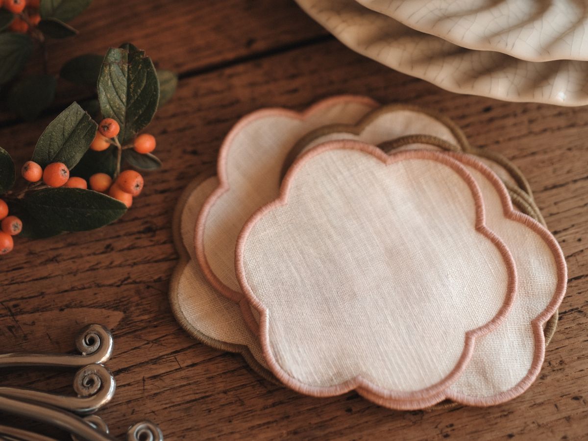 Scalloped linen coasters Powder pink & White (set of 4)