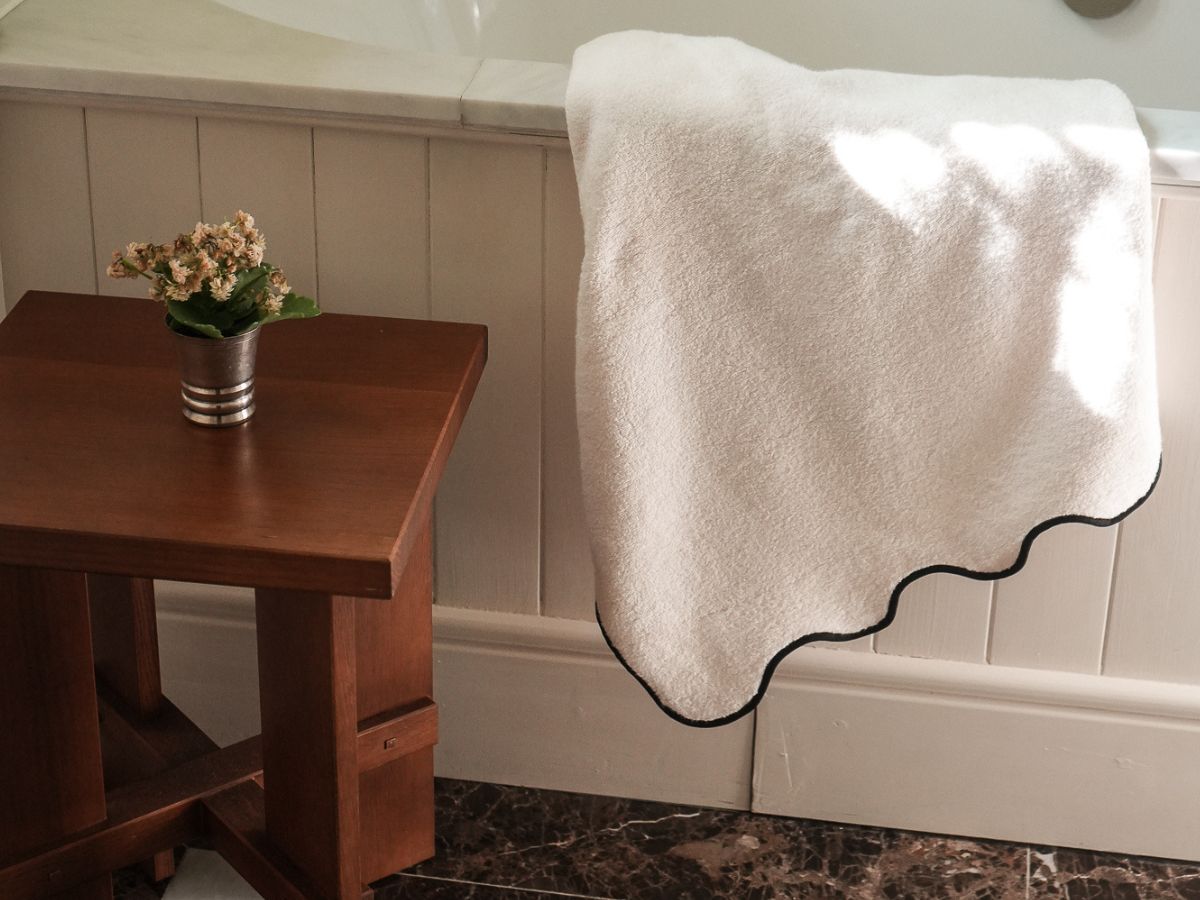 Tomète bath linens come in three elegant variations: ivory/ivory wavy bias, ivory/burgundy wavy bias and ivory/black wavy bias . Timeless and refined shades that fit easily into any bathroom.