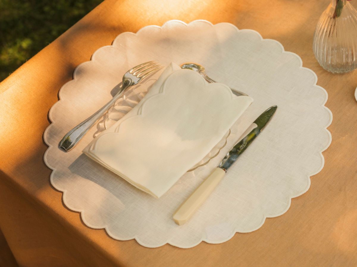 Découvrez nos serviettes de table festonnées, confectionnées à partir d'un lin premium European Flax et délicatement brodées au Portugal.