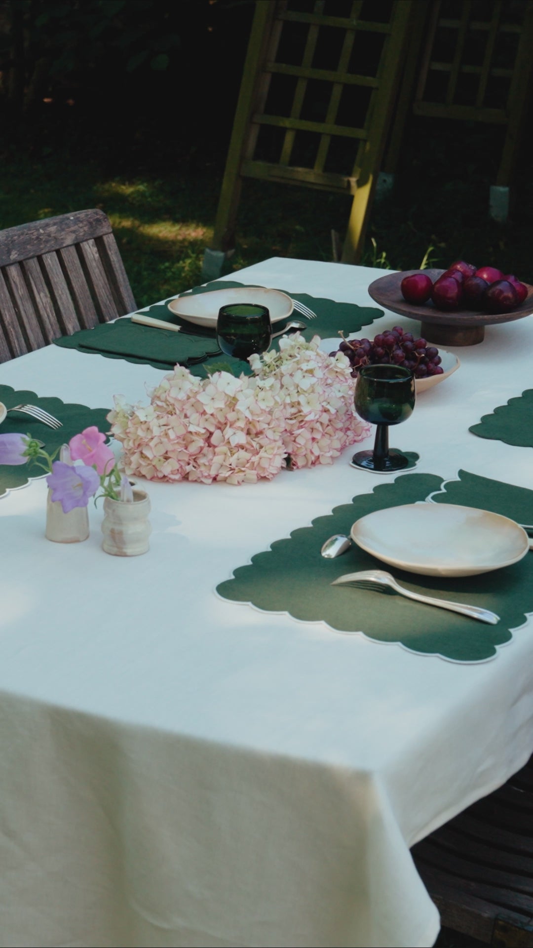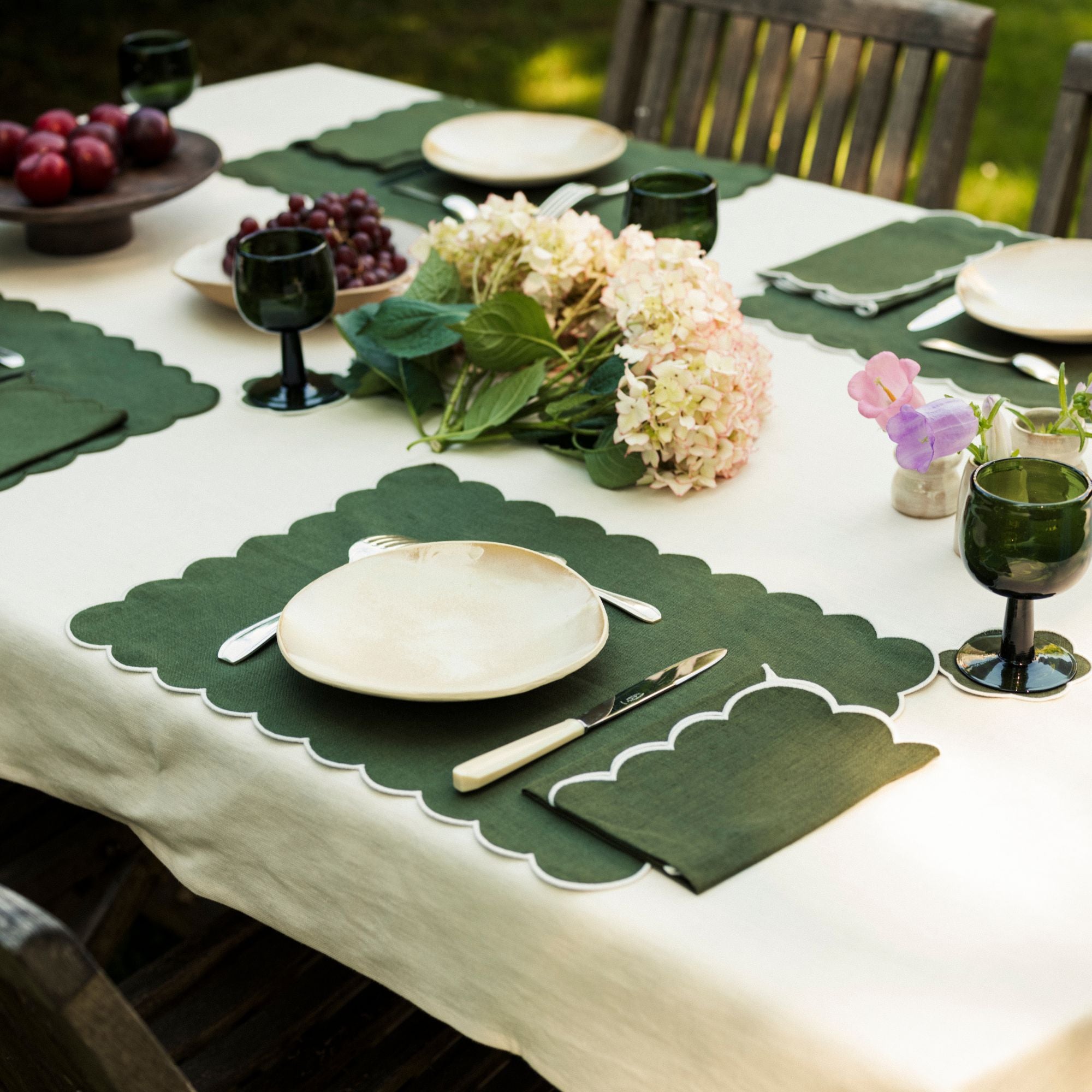 Forest green & white scalloped rectangular linen placemats (set of 2)