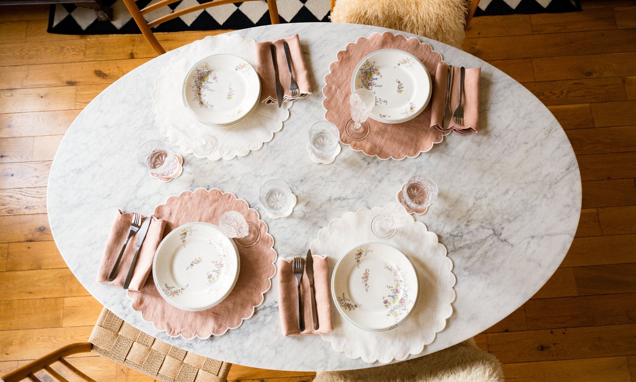 Les sets de table festonnés rose et blanc, et les coussins également qui vont naviguer entre le salon et la chambre. J’aime beaucoup la dernière nouveauté avec le linge de lit en percal de coton.
