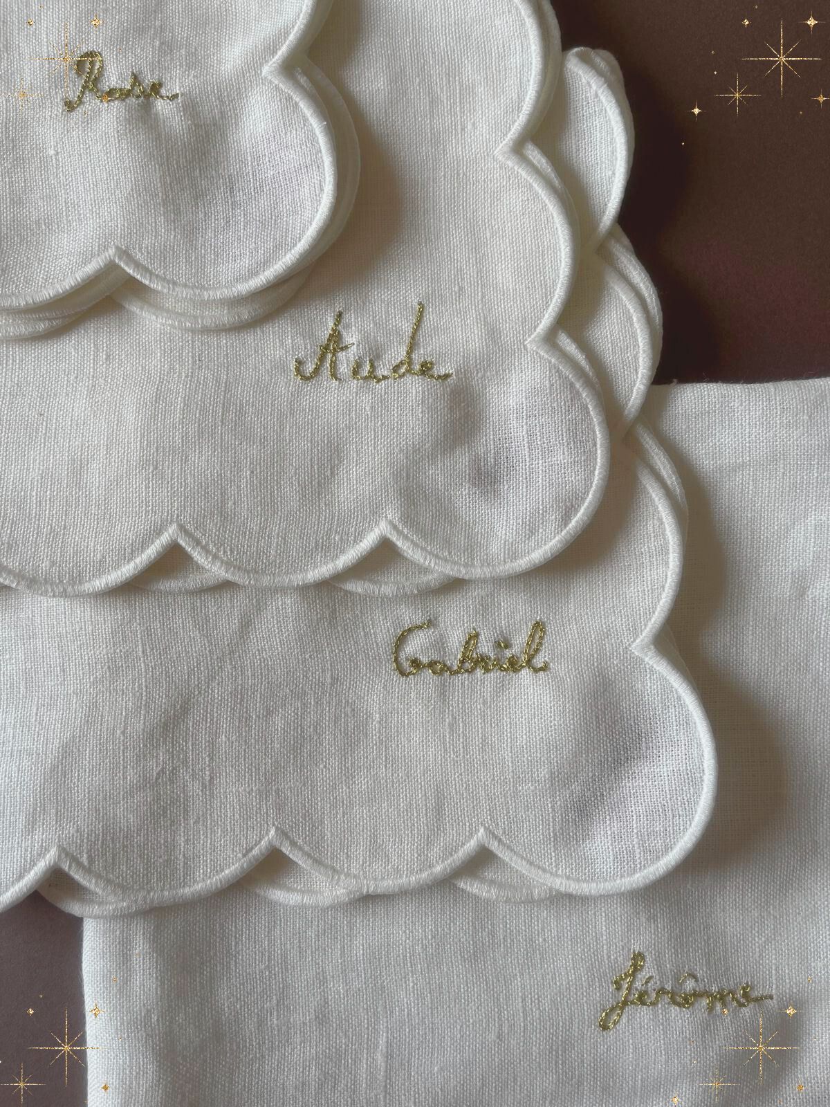 Pour 15€ supplémentaires, ajoutez des initiales ou un mot sur notre linge de table, linge de lit ou linge de bain grâce à notre service de broderies.