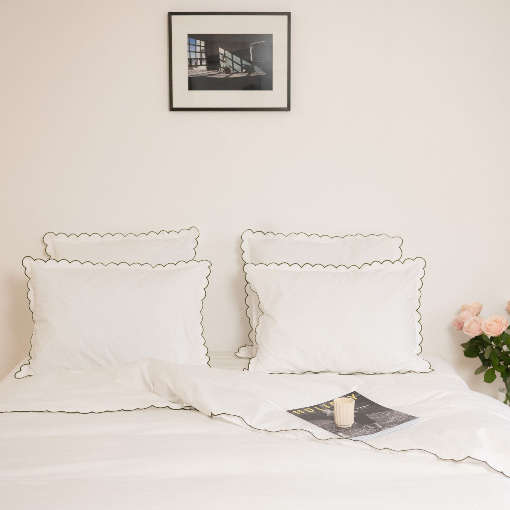 Les taies d'oreiller festonnées en percale de coton blanc & vert forêt (lot de 2)